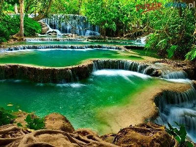 Prowincja Louangphrabang, Zieleń, Drzewa, Wodospad Kuang Si, Naturalne baseny, Laos, Kaskady, Las