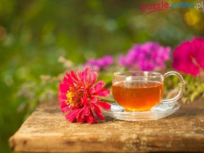 Kwiat, Rozmyte tło, Filiżanka, Herbata, Cynia