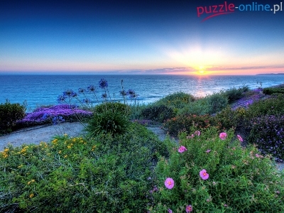 Puzzle Kwiatki, Morze, Wybrzeże, Zachód Słońca