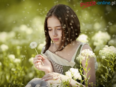Puzzle Kwiaty, Dziewczyna, Łąka, Dmuchawce