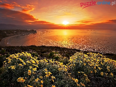 Kwiaty, Wybrzeże, Słońca, Morze, Łąka, Zachód