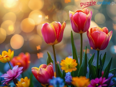 Puzzle Tulipany, Kwiaty, Czerwono-żółte, Bokeh