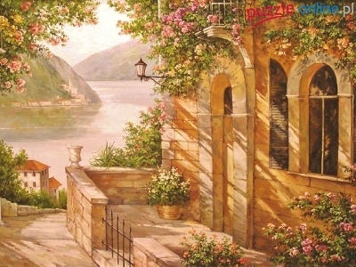 Puzzle Kwiaty, Uliczka, Dom, Morze