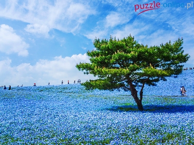 Hitachinaka, Japonia, Hitachi Seaside Park, Niebieskie, Kwiaty, Drzewo, Łąka, Porcelanki Menziesa