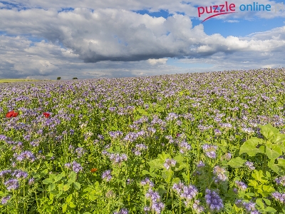 Drzewa, Pole, Lato, Kwiaty, Chmury, Facelia