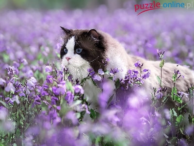 Fioletowe, Kot, Ragdoll, Kwiaty