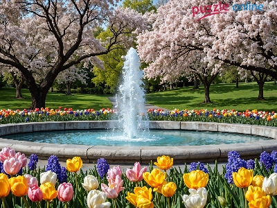 Kwitnące, Park, Wiosna, Kwiaty, Drzewa, Fontanna