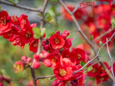 Czerwone, Pigwowiec japoński, Kwiaty, Listki, Gałązki