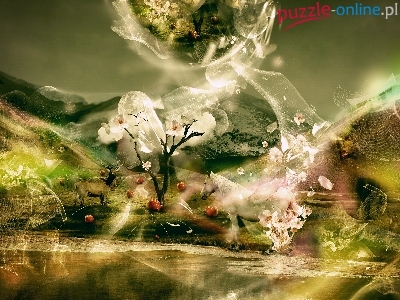 Kwiaty, Fantasy, Koń, Jeleń, Obraz