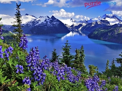 Puzzle Kwiaty, Góry, Jezioro, Łubinu