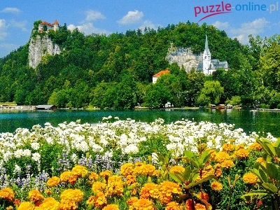 Kwiaty, Zamek, Słowenia, Kośclół, Jezioro, Bled