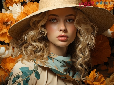 Puzzle Kapelusz, Kobieta, Blondynka, Kwiaty