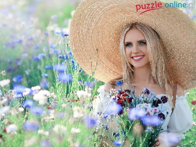 Puzzle Kapelusz, Blondynka, Kobieta, Kwiaty