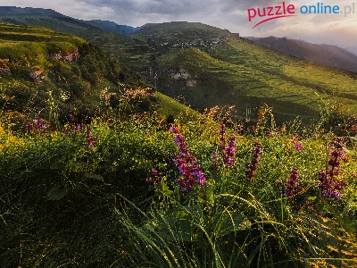 Kwiaty, Zachód Słońca, Polana, Dagestan, Góry, Tarasy, Rosja, Kaukaz Północny