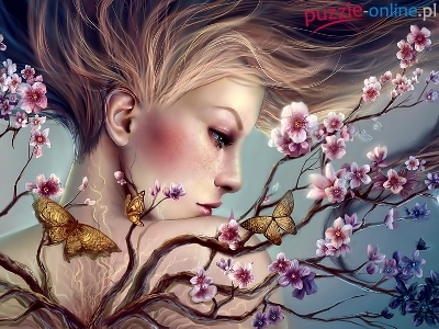 Puzzle Kwiaty, Fantasy, Kobieta, Motyle
