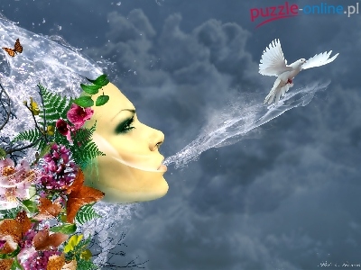 Puzzle Kwiaty, Fantasy, Kobieta, Ptak