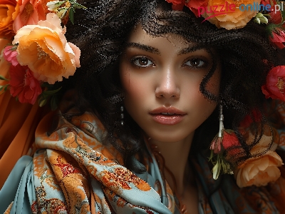 Puzzle Kobieta, Grafika, Szatynka, Kwiaty