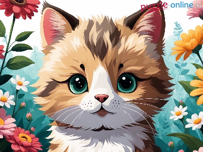 Puzzle Kolorowe, Grafika, Kot, Kwiaty