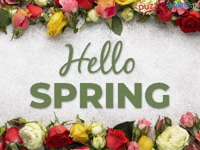 Hello Spring, Kolorowe, Kwiaty, Róże, Wiosna, Napis