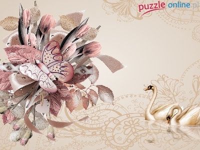Kwiaty, Łabędzie, Grafika, Kompozycja, Motyl