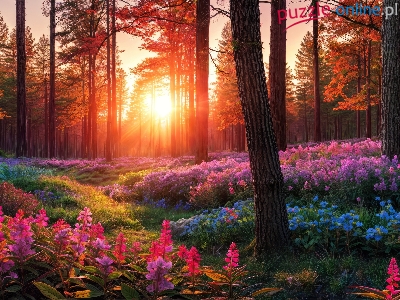 Drzewa, Kolorowe, Las, Kwiaty, Grafika, Zachód słońca