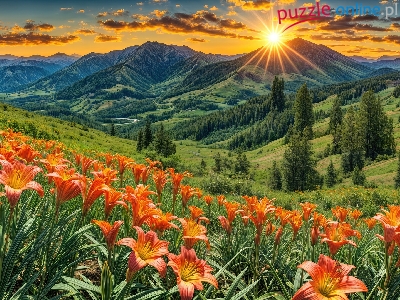 Promienie słońca, Lilie, Kwiaty, Dolina, Grafika, Góry