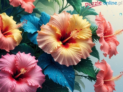Krople, Kolorowe, Hibiskusy, Kwiaty, Grafika, Liście
