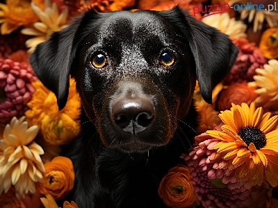Puzzle Mordka, Czarny, Pies, Kwiaty