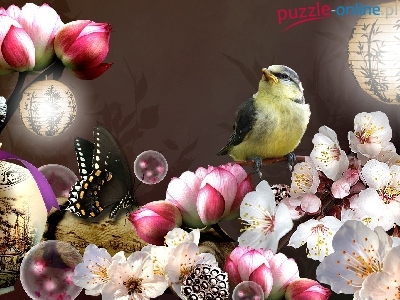 Puzzle Kwiaty, Ptaszek, Motyl, Art