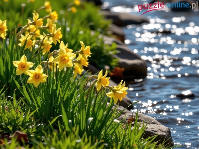 Puzzle Trawa, Kwiaty, Narcyzy żonkile, Rzeka