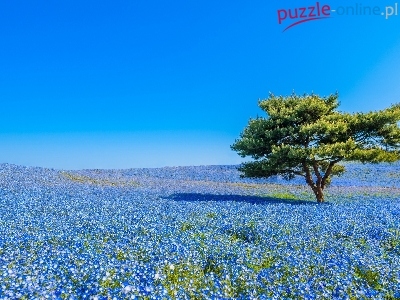 Puzzle Kwiaty, Łąka, Niebieskie, Drzewo