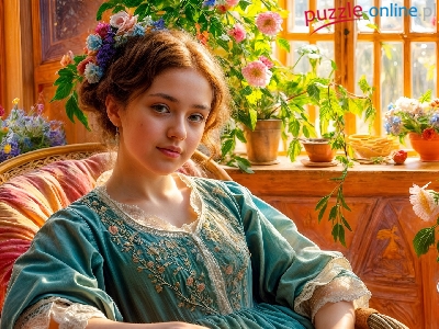 Puzzle Okno, Dziewczyna, Fotel, Kwiaty