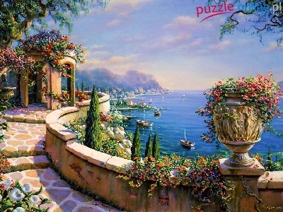 Kwiaty, Łódki, Taras, Patio, Morze