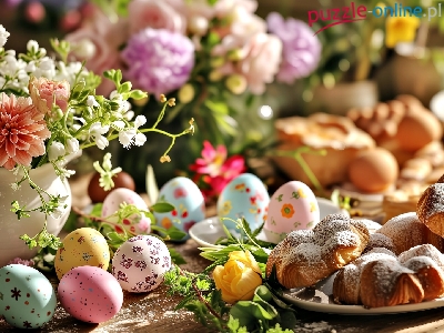 Pieczywo, Grafika, Pisanki, Stół, Śniadanie, Bukiet, Wielkanoc, Kwiaty