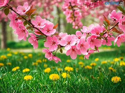 Łąka, Mniszek pospolity. Drzewo owocowe, Kwiaty, Różowe, Kwiaty