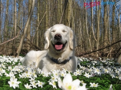 Puzzle Kwiaty, Golden Retriever, Drzewa