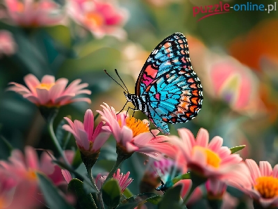 Puzzle Różowe, Kolorowy, Motyl, Kwiaty