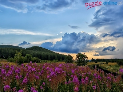 Kwiaty, Łąka, Wzgórza, Różowe, Chmury