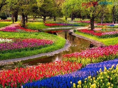 Kwiaty, Park, Rzeczka, Tulipany