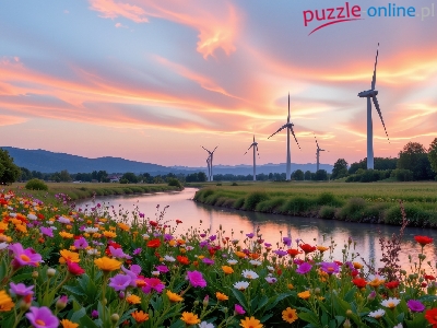 Drzewa, Łąka, Rzeka, Kwiaty, Grafika AI, Wiatraki