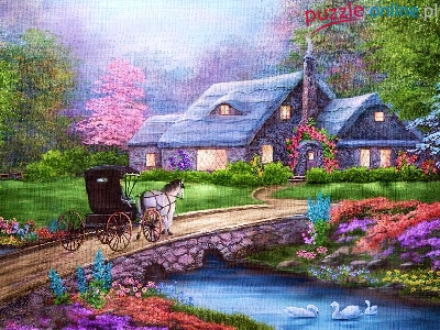 Kwiaty, Most, Powóz, Dom, Rzeka, Łabędzie