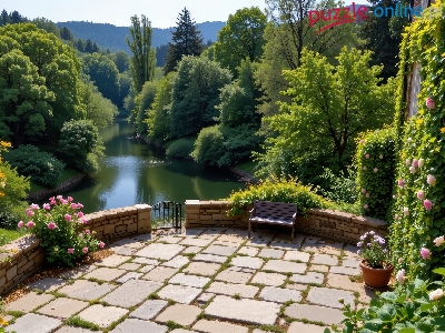 Drzewa, Pnącze, Taras, Kwiaty, Grafika, Rzeka