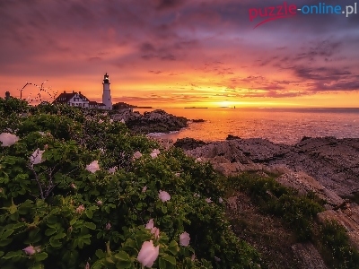 Skały, Kwiaty, Latarnia Morska, Morze, Zachód Słońca