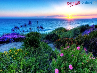 Puzzle Kwiaty, Morze, Zachód Słońca, Roślinność