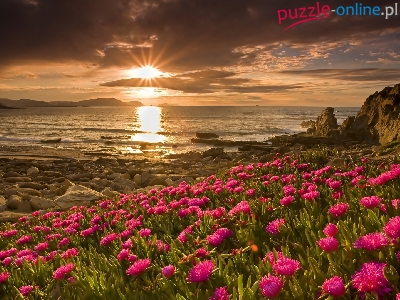 Puzzle Kwiaty, Zachód, Słońca, Morze