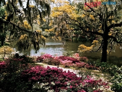 Kwiaty, Park, Staw, Drzewa
