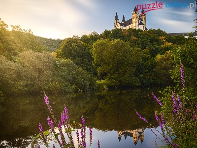 Odbicie, Wzgórze, Staw, Kwiaty, Zamek, Drzewa, Fioletowe