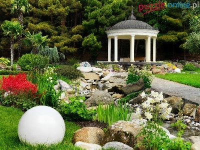 Kwiaty, Klomby, Park, Strumyk, Kamienie