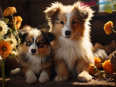 Puzzle Szczeniaki, Dwa, Psy, Kwiaty