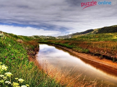 Puzzle Kwiaty, Rzeka, Trawa, Niebo